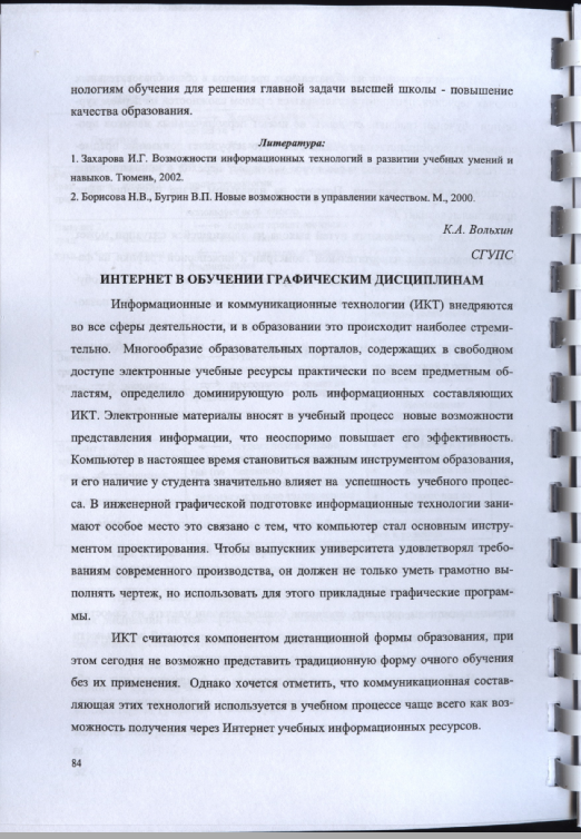 Вольхин, К.А. Интернет в обучении графическим дисциплинам [Текст] / К.А. Вольхин // Формирование инженерной культуры: современное состояние и перспективы развития / Сборник научных трудов. – Новосибирск Изд-во СГУПС 2008. С.84-86.