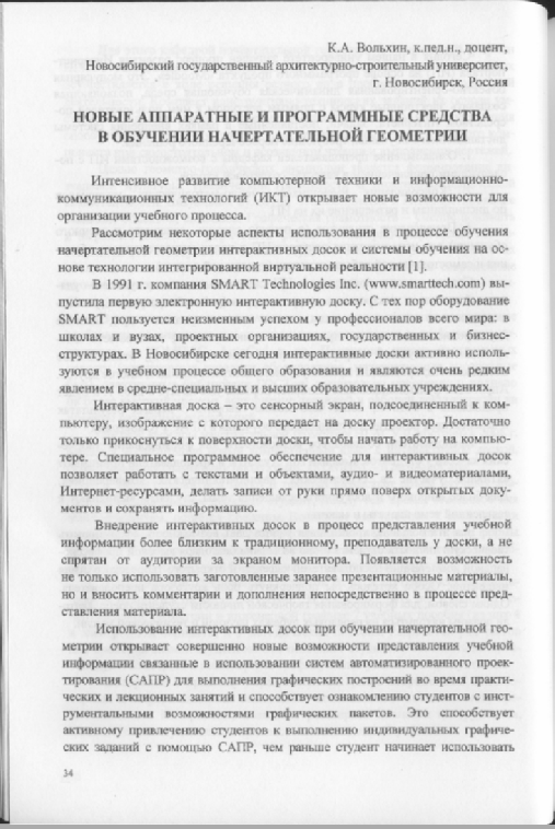 Вольхин, К.А. Новые аппаратные и программные средства в обучении начертательной геометрии [Текст] / К.А. Вольхин // Научно-методические проблемы графической подготовки в техническом вузе на современном этапе: Материалы Международной научно-методической конференции, посвященной 80-летию АГТУ, 15-17 сентября 2010 года. – Астрахань: Изд-во АГТУ, 2010. – С. 34-36.