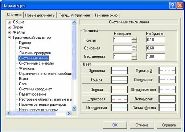 Толщина линий на экране и на бумаге изменяется командой Сервис – Параметры – Система – Графический редактор – Системные линии.
