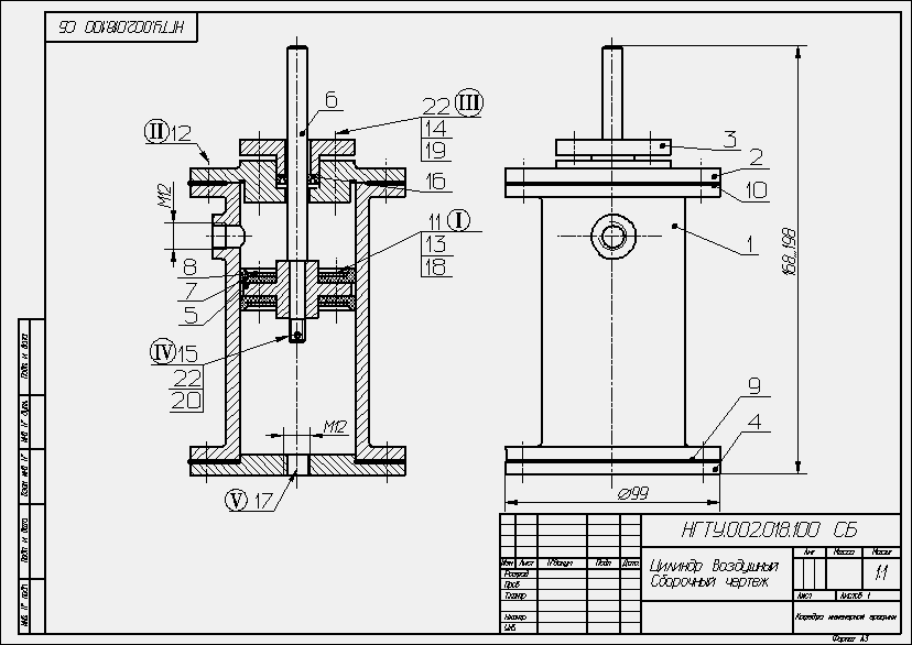 Чертеж выполнить на формате А2 в двух изображениях в масштабе 1:1. На чертеже выполнить следующие соединения: I – соединить диски 8 с поршнем 5 болтами 11 (резьба М6), установить шайбы 18 и гайки 13; II – выполнить соединение корпуса 1 с крышками 2 и 4 винтами 12 (резьба М8); III – выполнить соединение крышки 3 и крышки 2 шпильками 21 (резьба М8), установить шайбы 19 и гайки 14. IV – закрепить поршень 5 на штоке 6 посредством гайки 15 (резьба М12), шайбы 10 и шплинта 22; V – ввернуть в крышку 4 пробку 17 (резьба М20х1,5). Заполнить