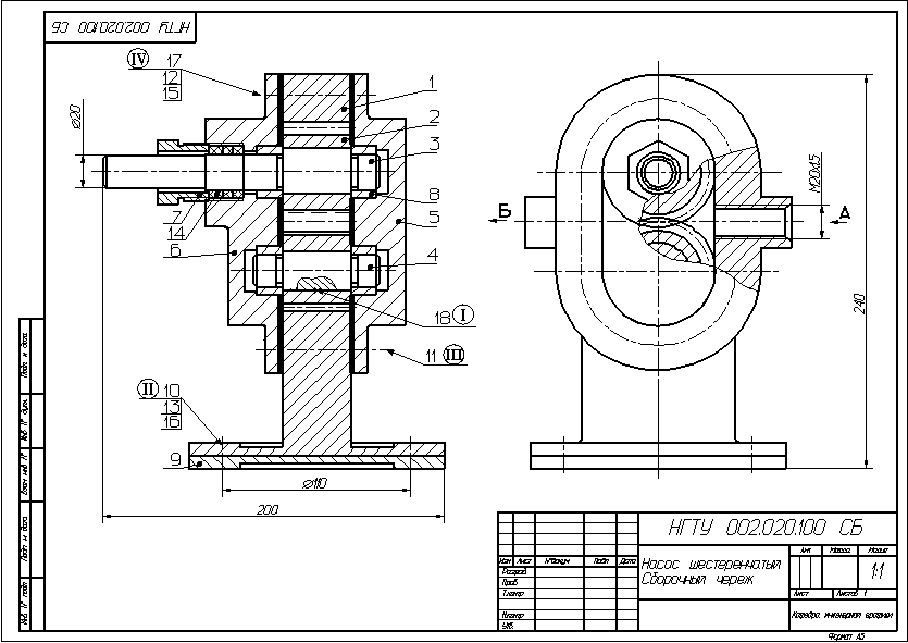 Чертеж выполнить на формате А2 в двух изображениях в масштабе 1:1. На чертеже выполнить следующие соединения: I – соединить зубчатое колесо 2 с осью 4 при помощи призматической шпонки 18(размеры шпонки 8х7х25); II – соединить корпус I с опорой 9 болтами 10(резьба М12), установить шайбы 16 и гайки 13; III – выполнить соединение крышки 5 с корпусом I винтами 11(резьба М10); IV – выполнить