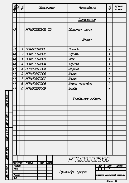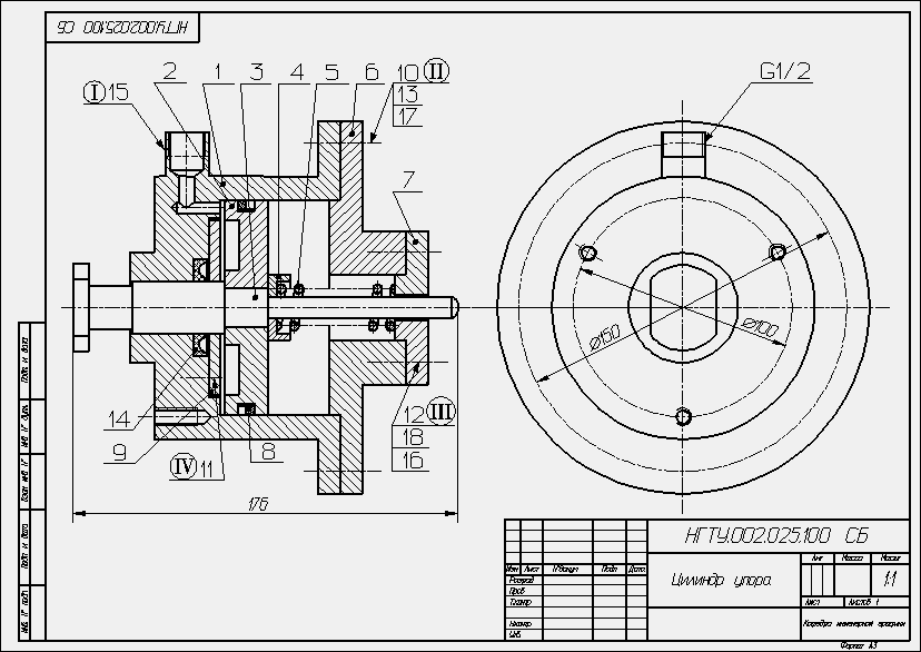 Чертеж цилиндра выполнить на формате А2 в масштабе 1:1 в двух изображениях. На чертеже выполнить следующие соединения: I – подсоединить к цилиндру1 угольник 15 (резьба G 1/2); II – выполнить соединение крышки 6 и цилиндра 1 болтами 10 (резьба М12), установить шайбы пружинные 17 и гайки 13; III – соединить крышки 7 и 6 шпильками 18 (резьба М10, материал крышки 6 – сталь), установить шайбы пружинные 16 и гайки12; IV – выполнить соединение шайбы 9 и цилиндра 1 винтами 2. Заполнить в спецификации графу «Стандартные изделия» |