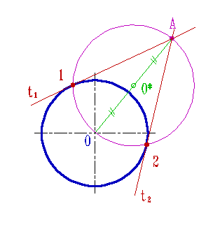 Касательную из точки А к окружности можно провести следующим образом: 1. На отрезке ОА как на диаметре строят окружность радиуса R=0,5[OA]; 2. Точки 1 и 2 пересечения полученной окружности с заданной определяют положение точек касания; 3. Отрезки [1A] и [2A] определяют положение касательных t1 и t2 проведенных из точки А к окружности. |