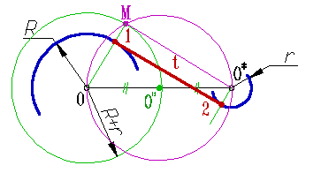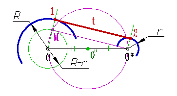 Внутреннее касание к двум дугам разного диаметра выполняется следующим образом: 1. Проводят окружность радиусом R+r из центра О дуги большего радиуса; 2. К полученной окружности строят касательную МO*, проходящую через центр дуги меньшего радиуса; 3. На луче ОМ отмечаем точку касания 1 - точка пересечения луча с дугой радиуса R; 4. Из центра O* проводим луч параллельный ОМ до пересечения с дугой радиуса r и отмечаем точку касания 2; 5. Через точки 1 и 2 проводим искомую касательную t. |