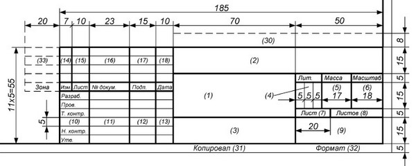 (1 - основная надпись, 2 - дополнительные графы)