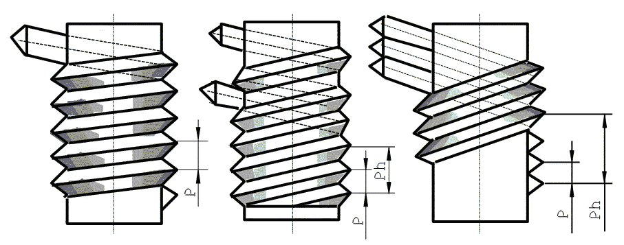 Ход резьбы (Ph) - расстояние по линии, параллельной оси резьбы, между исходной средней точкой на боковой стороне резьбы и средней точкой, полученной при перемещении исходной по винтовой линии на угол 360°, в однозаходной резьбе ход равен шагу, в многозаходной - произведению шага на число заходов n: Ph = nP (рисунок 102).