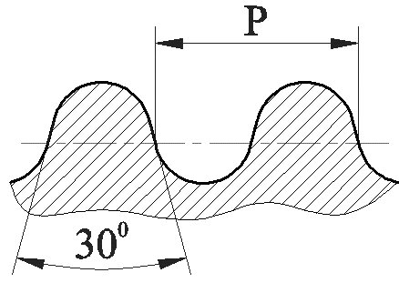 Резьба с профилем в виде равнобочной трапеции с углом 30о (рисунок 108). Применяется для передачи возвратно-поступательного движения или вращения в тяжело нагруженных подвижных резьбовых соединениях. Часто используется при изготовлении ходовых винтов, согласно ГОСТ 24738-81 выполняется на поверхностях диаметров от 8 до 640 мм.