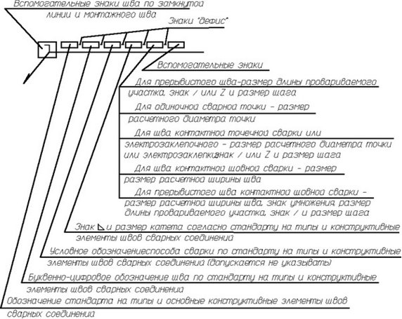 При необходимости в том же пункте технических требований следует приводить требования к качеству шва. Ссылку на номер пункта следует помещать на полке линии- выноски, проведенной от изображения шва.
