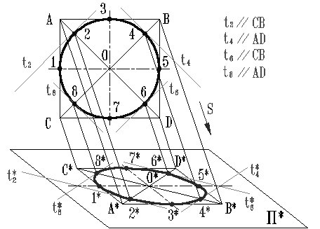 При параллельном проецировании окружности на какую-нибудь плоскость П* получаем ее изображение в общем случае в виде эллипса (рисунок 174).