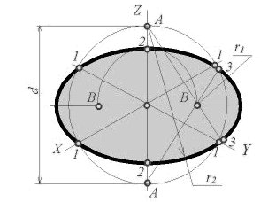 Построение диметрической проекции окружности представлено на рисунке 178. Если диметрическую проекцию выполняют без искажения по осям x и z то большая ось эллипсов 1, 2, 3 равна 1,06 диаметра окружности, а малая ось эллипса 1 - 0.95, эллипсов 2 и 3 - 0.35 диаметра окружности. Если диметрическую проекцию выполняют с искажения по осям x и z, то большая ось эллипсов 1, 2, 3 равна диаметру окружности, а малая ось эллипса 1 - 0.9, эллипсов 2 и 3 - 0,33 диаметра окружности.