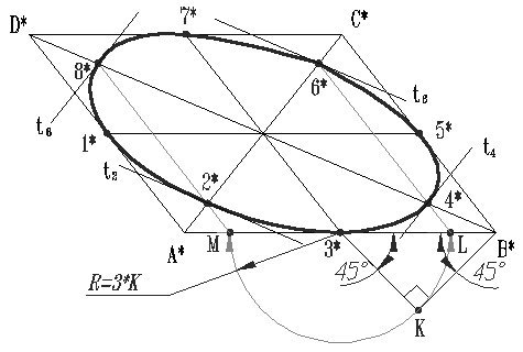 Как бы ни была расположена плоскость окружности, сначала целесообразно построить параллелограмм A*B*C*D* – параллельную проекцию квадрата ABCD, описанного около данной окружности, а затем с помощью восьми точек и восьми касательных вписать в него эллипс. Точки 1, 3, 5 и 7 – середины сторон параллелограмма. На отрезке 3*B*, как на гипотенузе, построить прямоугольный равнобедренный треугольник 3*KB*; из точки 3* радиусом 3*K описать полуокружность, которая пересечет A*B* в точках L и M; эти точки делят отрезок 3*A* и равный ему отрезок 3*B* в отношении 3:7; через точки L и М провести прямые параллельные боковым сторонам параллелограмма, и отметить точки 2*, 4*, 6* и 8* расположенные на диагоналях. Построить касательные к эллипсу в найденных точках. Касательные t2 и t6 параллельны BD, а касательные t4 и t8 параллельны AC. Получив восемь точек и столько же касательных, можно с достаточной точностью вычертить эллипс (рисунок 179).