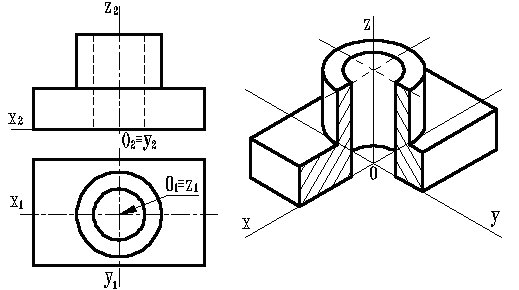 На ортогональном чертеже размечают оси прямоугольной системы координат, к которой и относят данный предмет. Оси ориентируют так, чтобы они допускали удобное измерение координат точек предмета. Например, при построении аксонометрии тела вращения одну из координатных осей целесообразно совместить с осью тела (рисунок 180)