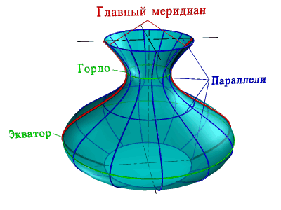 Каркас поверхности вращения состоит из множества окружностей, плоскости которых расположены перпендикулярно оси i. Эти окружности называются параллелями; наименьшая параллель называется горлом, наибольшая – экватором. Из закона образования поверхности вращения следуют два основных свойства: 1. Плоскость, перпендикулярная оси вращения, пересекает поверхность по окружности – параллели. 2. Плоскость, проходящая через ось вращения, пересекает поверхность по двум симметричным относительно оси линиям – меридианам. Плоскость, проходящая через ось параллельно фронтальной плоскости проекций, называется плоскостью главного меридиана, а линия, полученная в сечении, – главным меридианом. |