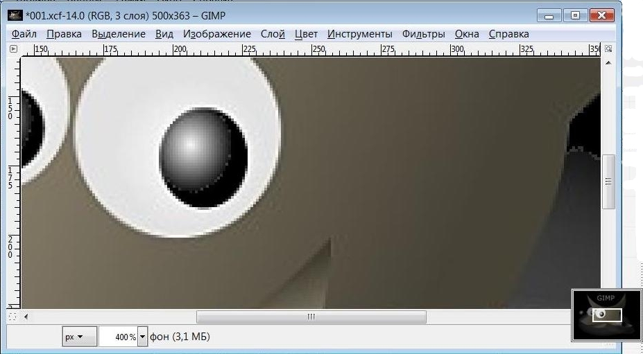 Панель навигации. Небольшая кнопка крестовидной формы расположена справа внизу под изображением. Щелчок по ней и удерживание левой кнопки мыши вызывает окно, показывающее изображения в миниатюре, с выделенной видимой областью. Двигая её, можно перемещаться по рисунку, отображая в окне требуемый участок изображения. При работе с большими изображениями, когда видна только небольшая часть, панель навигации зачастую наиболее удобный метод нахождения требуемой части изображения.