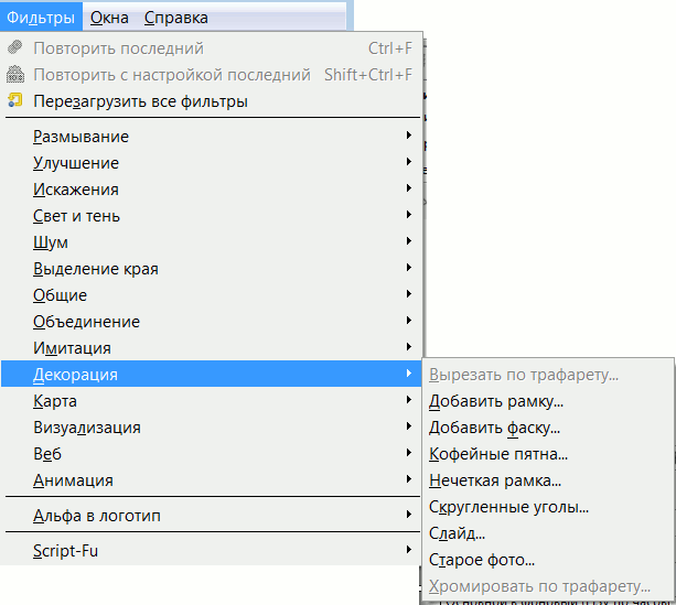 Эти фильтры — отдельные скрипты Script-Fu, зависимые от изображения. Они добавляют декоративные рамки и специальные эффекты к изображению.