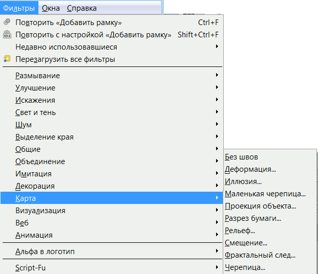 Фильтры используют объект "Карта", чтобы изменять изображение: вы проецируете изображение на объект. Таким образом вы можете создать трёхмерные эффекты, проецируя изображение на изображение с рельефом (фильтр "Рельеф") или сферу (фильтр "Спроецировать объект"). Также можно спроецировать часть изображения на то же изображение (фильтры "Иллюзия" и "Без швов"), согнуть текст по кривой (фильтр "Замещение")... |